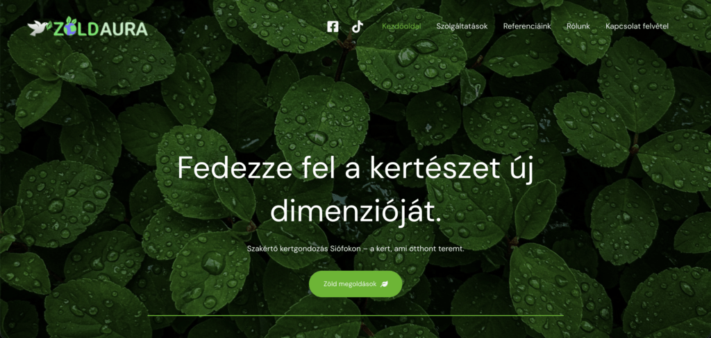 A Zöld Aura kertészeti vállalkozás digitális jelenlétét egy természetközeli, bizalmat árasztó weboldallal alapoztuk meg. A design fókuszában a minőségi munka és az esztétika áll, kiemelve a kertépítés és fenntartás minden apró részletét. Az oldal segíti a leendő ügyfeleket abban, hogy gyorsan megismerjék a szolgáltatásokat és egyszerűen felvegyék a kapcsolatot a szakemberekkel.